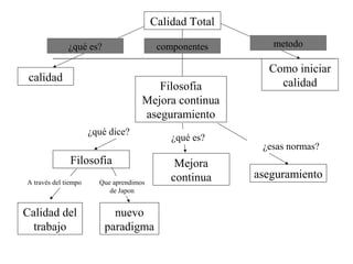 Este documento trata sobre la calidad y la gestión de la calidad. Explica conceptos clave como la definición de calidad, las dimensiones de la calidad desde la perspectiva del cliente, los costos asociados con la mala calidad, y los principales pensadores y enfoques de la calidad como la filosofía, la administración de la calidad total, y las normas ISO 9000 para el aseguramiento de la calidad. Además, describe brevemente los beneficios de implementar sistemas de aseguramiento de la calidad.