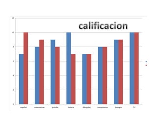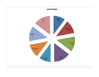 El resumen presenta los porcentajes de las calificaciones obtenidas por un estudiante en diferentes materias. Las materias con mayor porcentaje fueron historia y química con un 15% cada una. Las materias con menor porcentaje fueron español y dibujo técnico con un 10% cada una.