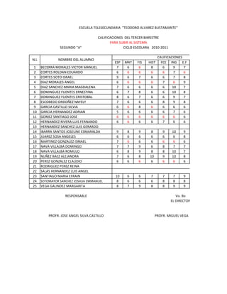 Este documento presenta los resultados del tercer bimestre de la Escuela Telesecundaria "Teodoro Alvarez Bustamante". Incluye las calificaciones de 25 alumnos del segundo grado A en las asignaturas de Español, Matemáticas, Física, Historia, Formación Cívica y Ética e Inglés, así como su promedio general. También incluye una tabla revisada de calificaciones para subir al sistema.