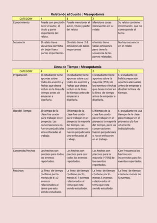 Este documento contiene una serie de rúbricas para evaluar el conocimiento y las habilidades de un estudiante en relación con Mesopotamia. Las rúbricas miden la capacidad del estudiante para crear un mapa, proyecto multimedia, relato y línea de tiempo sobre Mesopotamia, evaluando aspectos como el conocimiento demostrado, la organización, el contenido y la precisión de los hechos.