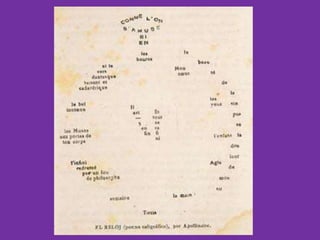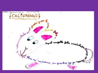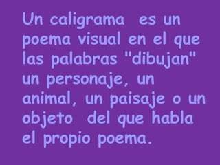 Un caligrama es un poema visual donde las palabras forman figuras relacionadas con el tema del poema. Su origen se remonta a la antigua Grecia, pero ha evolucionado a lo largo de los siglos en diversas culturas. Hoy en día, se utiliza como una forma de expresión artística que también es explorada por niños y nuevos creadores.