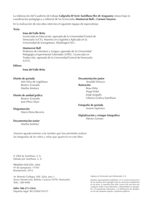 Este documento describe el Cuaderno de trabajo Caligrafía III Serie Santillana Flor de Araguaney. Explica que el cuaderno ayuda a desarrollar la habilidad de leer, comprender y escribir con letra clara. Incluye páginas para practicar caligrafía, normas ortográficas, actividades lúdicas y lecturas cortas con preguntas. Al final presenta el alfabeto y números.