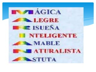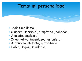 Este documento trata sobre tres temas: la personalidad del autor, el amor y la muerte. En cada sección, el autor utiliza adjetivos que comienzan con la misma letra para describir cada tema de manera poética. Describe su propia personalidad como sincero, sociable y soñador, y expresa su anhelo por los ojos de su amada a pesar de no verla. Finalmente, representa a la muerte como una guadaña que arrebata la vida de forma inesperada.