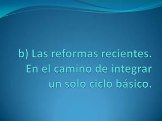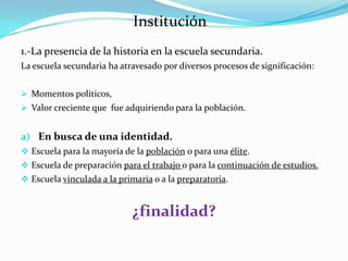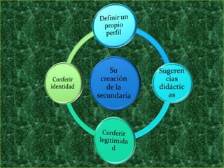 La secundaria en México ha atravesado diversos procesos de definición desde su creación. Originalmente estaba ligada a la preparatoria, pero con el tiempo se consolidó como un nivel independiente con el objetivo de brindar una educación más práctica y vinculada a las necesidades de los estudiantes y la sociedad. A lo largo de los años, se han realizado varias reformas educativas para precisar los objetivos y contenidos de la secundaria y vincularla mejor con la primaria. En la actualidad, la secundaria sigue siendo uno de los princip