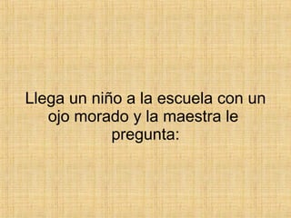 El niño llega a la escuela con moretones en el rostro en dos ocasiones. La primera vez explica que dormía en la misma cama que sus padres y hermano, y que su padre lo golpeó cuando le preguntó si estaba dormido mientras tenía relaciones con su madre. La maestra le aconseja que se quede callado la próxima vez. Al día siguiente llega con otro moretón porque habló cuando sus padres estaban teniendo relaciones nuevamente. La tercera vez, su hermano se cae de la cama y se rompe la cabe