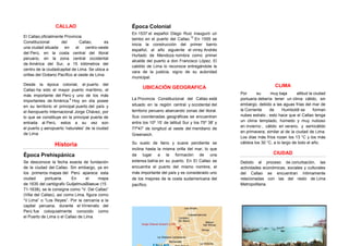 El Callao se encuentra a 15 km de Lima y es el principal puerto del Perú desde la época colonial. En la actualidad alberga el puerto marítimo más importante del país y el aeropuerto internacional Jorge Chávez. El Callao tiene un clima templado y húmedo debido a la corriente de Humboldt y su economía está estrechamente vinculada a la de Lima metropolitana.