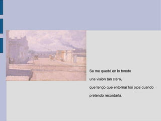 El poema describe una calle en la ciudad. Menciona solares vacíos a un lado y casas alineadas esperando la primavera al otro. Las sábanas aún húmedas cuelgan de las ventanas riendo con el viento y el sol. Niñas bonitas se peinan afuera y niños cantan en la escuela. A las once, un anciano empuja su carrito de naranjas por el arroyo.