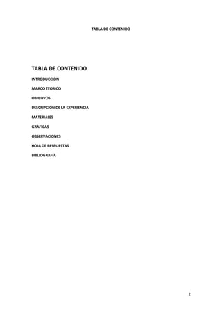 Este documento presenta los resultados de un experimento para determinar el calor específico de diferentes materiales. Describe el marco teórico del calor específico, los objetivos y materiales del experimento, así como los procedimientos seguidos. Los estudiantes utilizaron un calorímetro y el sistema Cassy Lab para medir el calor específico del aluminio, hierro y latón, y compararon los datos experimentales con los teóricos.