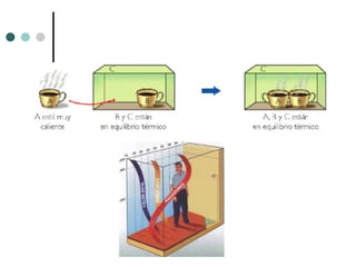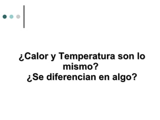 Este documento explica la diferencia entre calor y temperatura. La temperatura es una medida del movimiento molecular de una sustancia y depende del estado de la misma, mientras que el calor es una forma de energía que se transfiere de un cuerpo a otro. También describe los tres estados de la materia - sólido, líquido y gaseoso - y los procesos de cambio de estado como fusión, vaporización, solidificación y condensación. Finalmente, cubre temas como la medición de la temperatura a través de termómetros y diferentes escalas, y los