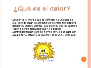 Este documento trata sobre el calor y la temperatura. Explica que el calor es la energía que se transfiere entre cuerpos a diferentes temperaturas, y que no es una sustancia que se posee. También define la temperatura como la medida de la energía térmica de un cuerpo, y menciona que los termómetros se usan para medir la temperatura. Además, describe los diferentes tipos de conductores y aislantes del calor, así como las formas de transmitir calor.