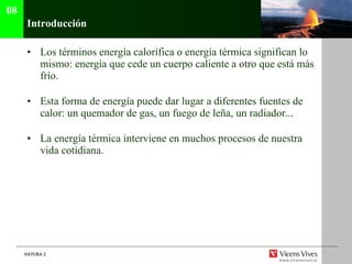 El documento habla sobre el calor y la temperatura. Explica que el calor es una forma de energía que se transfiere de los cuerpos calientes a los fríos. Describe los diferentes efectos del calor como la dilatación, los cambios de estado de la materia, y cómo se propaga el calor a través de la conducción, convección y radiación. También discute los materiales conductores y aislantes del calor.