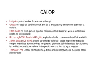 El documento trata sobre el calor y la temperatura. Explica que el calor es una forma de energía asociada al movimiento molecular que se transfiere de un sistema a otro debido a las diferencias de temperatura. La temperatura es la medida promedio de la energía cinética de las partículas de un sistema y se mide con termómetros. Existen diferentes mecanismos de transferencia de calor como la conducción, convección y radiación.