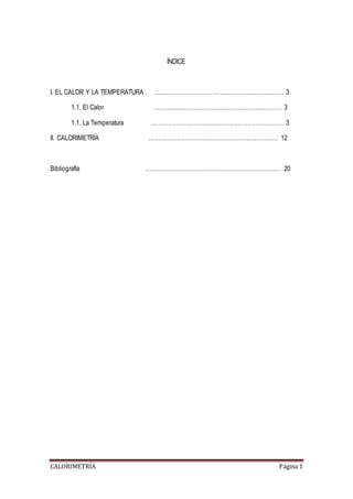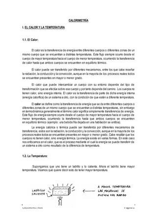 El documento trata sobre la calorimetría. Brevemente describe que el calor es la transferencia de energía entre cuerpos a diferentes temperaturas, y que la temperatura es una medida de la agitación molecular. Luego, explica cómo la temperatura puede definirse en términos de la ley cero y segunda de la termodinámica.