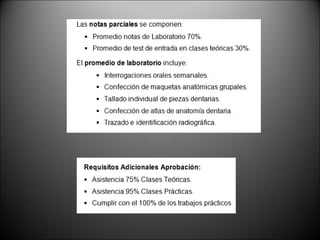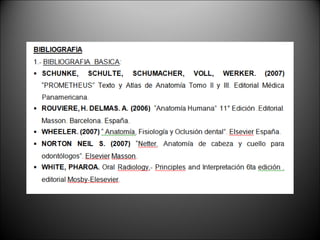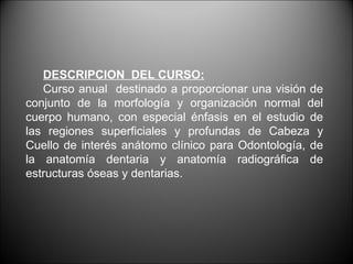 Este documento presenta un resumen del curso de anatomía para odontología. El curso se enfoca en la morfología y organización normal del cuerpo humano, con énfasis en la cabeza, cuello y estructuras dentarias y óseas relacionadas. Incluye información sobre la conducta del curso, profesores a cargo, y una introducción a conceptos básicos de anatomía como planos anatómicos, nomenclatura, constitución del cuerpo humano y sus regiones y cavidades.