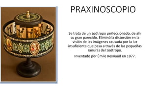 Este documento describe cuatro predecesores tempranos del cine: el praxinoscopio, inventado por Émile Reynaud en 1877, que perfeccionó el zoótropo eliminando distorsiones; el taumatropio creado por John Ayton en 1824 que gira dos imágenes para crear una ilusión combinada; el fenaquistiscopio inventado por Josep-Antoine Ferdinand Plateau en 1829 que usa un disco y espejo para proyectar ilusiones; y el estroboscopio creado por Simon von Stampfer en 1829 que hace