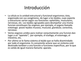 El documento presenta una introducción a la histología, la ciencia que estudia la estructura microscópica de los tejidos. Explica que las células son la unidad básica de los organismos y que cuando se agrupan forman tejidos como el epitelial, muscular y nervioso. Luego describe las partes fundamentales de la célula como el núcleo, citoplasma y organitos, con énfasis en la estructura y función del núcleo donde se encuentra el material genético. Finalmente, resume los procesos de división celular