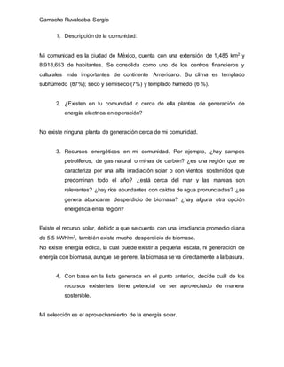 La comunidad descrita es la Ciudad de México, que tiene casi 9 millones de habitantes y cuenta con recursos solares pero no plantas de generación eléctrica cercanas. El recurso energético con mayor potencial es la energía solar debido a los altos niveles de irradiación, aunque también existe biomasa disponible.