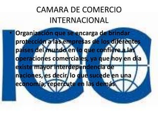 La Cámara de Comercio Internacional (CCI) es una organización creada en 1919 para fomentar el comercio mundial. La CCI brinda servicios como resolución de disputas, prevención de delitos comerciales, y regulación de instrumentos como cartas de crédito. Está compuesta por comités nacionales y expertos de más de 130 países que trabajan para facilitar el comercio internacional.