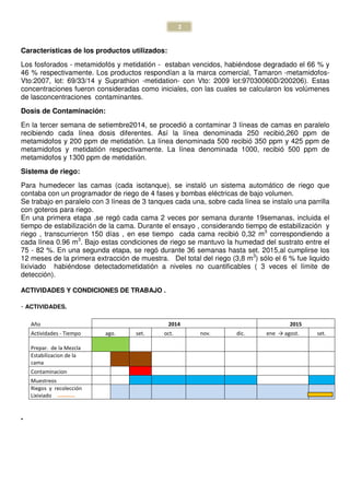 Este resumen describe un estudio de 14 meses sobre la degradación biológica de plaguicidas organofosforados en camas de biopurificación. Los plaguicidas se degradaron rápidamente, sin detectarse residuos a los 365 días. El metamidofós se degradó en menos de 75 días, mientras que la metidation requirió más tiempo y su degradación dependió de la concentración inicial. El sistema demostró ser efectivo para tratar altas concentraciones de plaguicidas de forma accesible para agricultores.