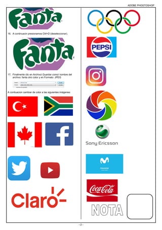 El documento proporciona una guía paso a paso sobre cómo cambiar el color de imágenes en Adobe Photoshop. Incluye instrucciones sobre la creación de un nuevo archivo, el uso de herramientas de selección y ajustes de tono, saturación y luminosidad. Finalmente, se instruye sobre cómo guardar el archivo modificado en formato JPEG.