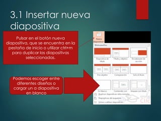 Este documento describe diferentes formas de trabajar con diapositivas en PowerPoint, incluyendo insertar nuevas diapositivas, seleccionar diapositivas, copiar, duplicar y mover diapositivas, y eliminar diapositivas. Proporciona instrucciones detalladas sobre cómo realizar cada una de estas tareas utilizando las herramientas y comandos de PowerPoint.