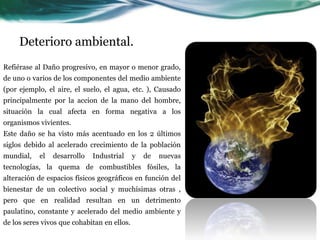 El documento describe los conceptos de deterioro ambiental, cambio climático y efecto invernadero. El deterioro ambiental ha dañado recursos como el agua, el aire y los suelos debido a la población, industrialización y quema de combustibles fósiles. El cambio climático implica variaciones en el clima causadas por actividades humanas como la deforestación y quema de combustibles. El efecto invernadero ocurre naturalmente pero se ha intensificado por los gases de efecto invernadero, causando calentamiento global y consecuencias como sequías