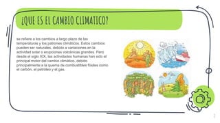 El documento describe las causas y efectos del cambio climático. Las principales causas son la quema de combustibles fósiles para generar energía, la industria, el transporte, la agricultura y la tala de bosques. Los efectos incluyen el aumento de temperaturas, tormentas más severas, sequías, subida del nivel del mar, extinción de especies, escasez de alimentos y mayores riesgos para la salud.