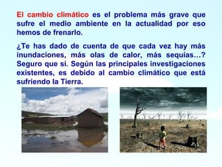 El documento describe los efectos del cambio climático causado por el aumento de gases de efecto invernadero debido a las actividades humanas. Explica cómo estos gases atrapan el calor en la atmósfera causando el calentamiento global, y los sectores como la industria, el transporte y la agricultura que contribuyen a las emisiones. También detalla algunos de los impactos observados como el derretimiento del hielo polar y eventos meteorológicos más extremos.