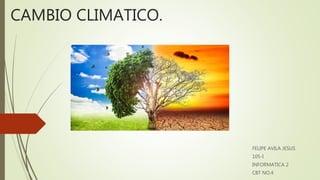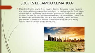 El documento trata sobre el cambio climático. Explica que los gases de efecto invernadero producidos de forma natural hacen que la Tierra sea habitable, pero que la actividad humana ha aumentado su cantidad en la atmósfera. También describe acuerdos internacionales como el Protocolo de Kyoto y el Acuerdo de París para combatir el cambio climático y reducir las emisiones de carbono.