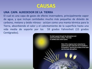 El documento detalla cómo los gases de efecto invernadero, principalmente generados por actividades humanas, están contribuyendo al calentamiento global, alterando el clima y afectando la vida en la Tierra. Se mencionan los principales gases involucrados, como el dióxido de carbono, metano y óxidos nitrosos, así como sus fuentes y efectos. Además, se anticipan consecuencias regionales del cambio climático, que impactan la agricultura, el acceso al agua y la biodiversidad en diferentes partes del mundo.