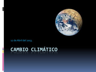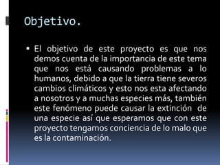 Este documento trata sobre el cambio climático. Explica que el cambio climático se refiere a la modificación del clima a escala global o regional, causada tanto por factores naturales como por la actividad humana. El objetivo del proyecto es crear conciencia sobre la importancia de este tema y los problemas que causa a los humanos y otras especies. El documento también analiza las causas del cambio climático y pensamientos sobre el futuro si no se toman medidas para detenerlo.
