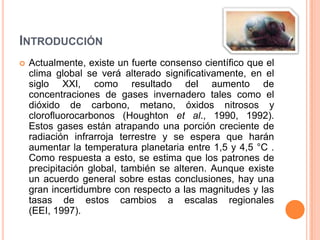 El documento describe el consenso científico sobre el cambio climático causado por el aumento de gases de efecto invernadero como el dióxido de carbono y el metano. Se espera que las temperaturas globales aumenten entre 1.5 y 4.5 ° C para el 2100, alterando los patrones de precipitación. Los datos clave incluyen que los 10 años más cálidos han ocurrido después de 1980 y que las emisiones de gases de efecto invernadero deben reducirse entre un 50-70% para estabilizar el clima.