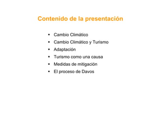 El documento habla sobre una conferencia regional sobre soluciones climáticas para el sector turístico en los países de las Américas y el Caribe. Explica cómo el cambio climático está afectando al turismo a través de impactos directos e indirectos en los destinos, y cómo el turismo también contribuye al cambio climático a través de las emisiones. Se discuten medidas de adaptación y mitigación que pueden tomar los actores del turismo para reducir los riesgos climáticos y las emisiones de carbono.