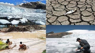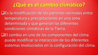 Este documento describe el cambio climático y el efecto invernadero. Explica que el cambio climático implica la modificación de los patrones normales de temperatura y precipitaciones en una zona. También discute las causas naturales y antropogénicas del cambio climático actual, incluyendo las emisiones de gases de efecto invernadero como el dióxido de carbono y el metano por actividades humanas. Finalmente, define el efecto invernadero como el fenómeno por el cual los gases en la atmósfera retienen