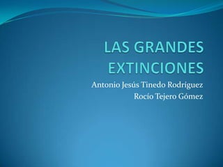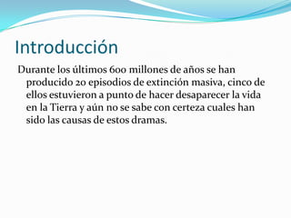 Este documento resume seis de las grandes extinciones masivas que han ocurrido en la Tierra a lo largo de los últimos 600 millones de años, incluyendo las causas propuestas de cada una. También menciona la posibilidad de una séptima extinción masiva actual debido a la actividad humana.