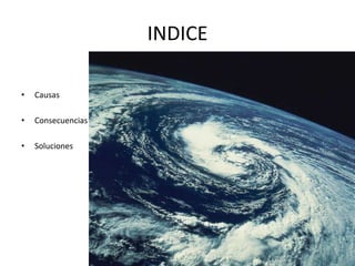 El documento resume las causas, consecuencias y soluciones del cambio climático. Las causas son el aumento de los gases de efecto invernadero que provocan un calentamiento global. Las consecuencias incluyen un aumento de las temperaturas, la frecuencia de días extremos, la disminución de lluvias, mayores riesgos naturales y efectos negativos en los recursos y sectores económicos. Las soluciones propuestas son reducir las emisiones de CO2 adoptando medidas de eficiencia energética, uso de transporte público y energ