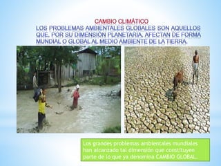 El documento describe los principales problemas ambientales globales como el cambio climático, la pérdida de biodiversidad y la contaminación. Explica las consecuencias del cambio climático, incluido el aumento del nivel del mar, las enfermedades, la escasez de alimentos y agua. También describe la crisis ambiental en Colombia debido a la deforestación, contaminación del agua, y factores como el acceso libre a los recursos naturales y la falta de inversión estatal en temas ambientales.