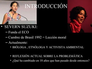 El documento presenta la problemática medioambiental desde diferentes perspectivas. Resume las conclusiones de varias conferencias internacionales sobre el medio ambiente desde 1972 y analiza la realidad actual. Plantea que la inactividad política individual es parte del problema y propone la educación, la industria comprometida y la acción ciudadana como posibles soluciones.