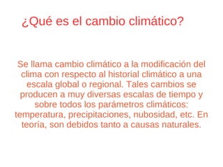 El documento describe las causas del cambio climático, incluyendo variaciones solares y orbitales, impactos de meteoritos, deriva continental, composición atmosférica, corrientes oceánicas, campo magnético terrestre y efectos antropogénicos como la emisión de gases debido al consumo humano. También explica que los pequeños desencadenantes causados por estos factores, ya sean forzamientos sistemáticos u ocurrencias imprevistas, pueden dar lugar a grandes cambios climáticos. Por último, señala que