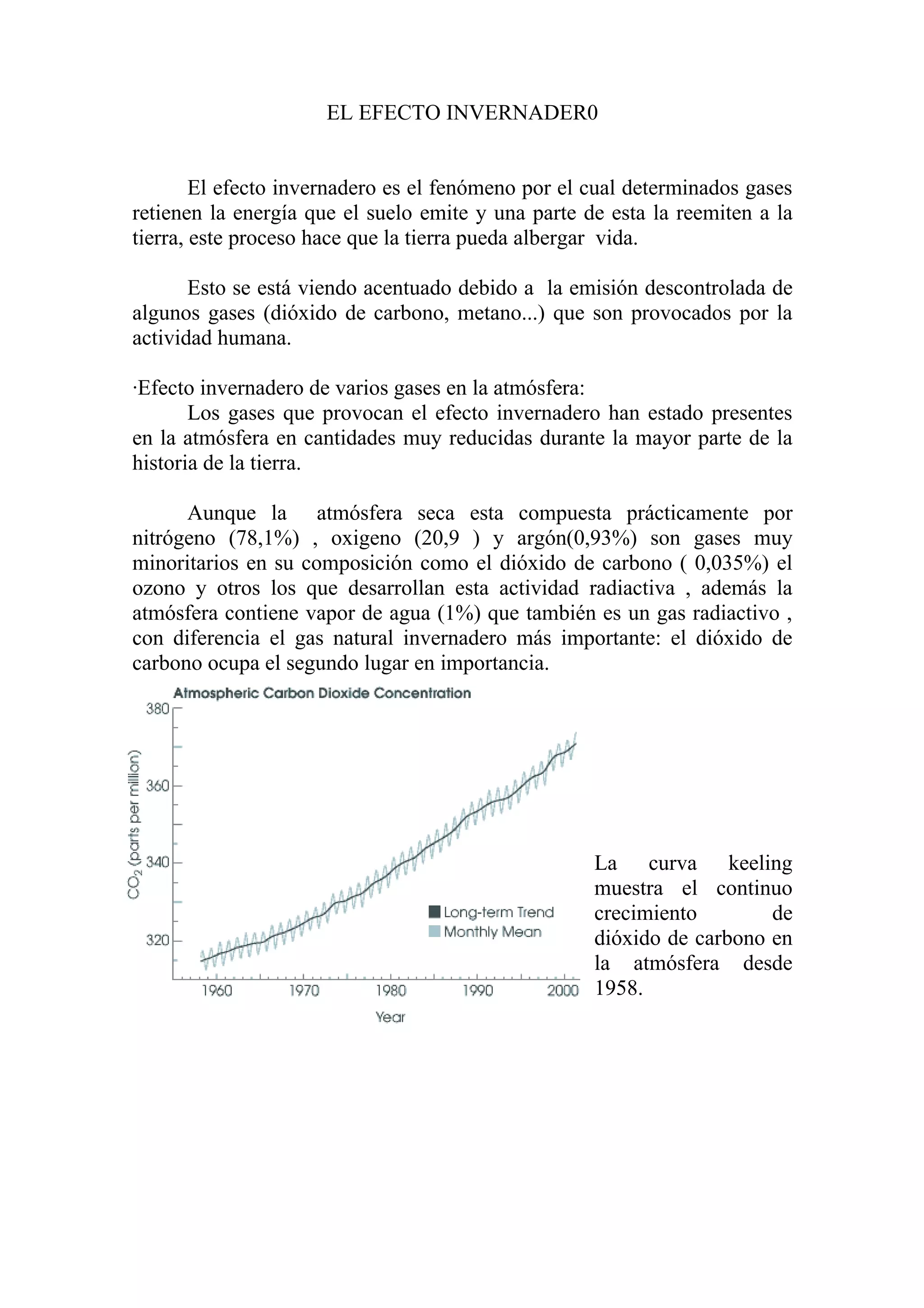 El documento describe el efecto invernadero y cómo los gases emitidos por la actividad humana como el dióxido de carbono están acentuando este efecto, causando un calentamiento global. Explica la historia del conocimiento científico sobre este tema y las proyecciones de sus consecuencias, como el aumento del nivel del mar. También resume los intentos de abordar este problema a través del Protocolo de Kioto y la Conferencia de Copenhague.