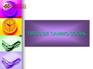 Este documento describe dos tipos de cambio social: cambio estructural y cambio coyuntural. El cambio estructural implica modificaciones en las relaciones sociales y las instituciones que componen la sociedad de manera permanente sin poner en riesgo su existencia, como cambios en el gobierno o la economía. El cambio coyuntural busca corregir desequilibrios temporales en parte del sistema sin transformaciones globales. Se presenta en momentos específicos debido a disfunciones o eventos extraordinarios como crisis económicas, migraciones, desast
