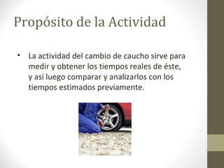 El documento describe los pasos y resultados de un cambio real de caucho de un automóvil. El proceso se dividió en 14 pasos cronometrados, tomando un total de 21 minutos y 51 segundos. Esto fue mayor al tiempo estimado debido a imprevistos como la ubicación del repuesto, apretado de tuercas, tipo de gato y habilidad del mecánico.