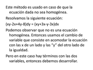 Este documento describe cómo resolver una ecuación diferencial no homogénea mediante el cambio de variables. Explica que se deben acomodar los términos con x de un lado de la igualdad y los términos con y del otro lado, y luego factorizar. Después de realizar estos pasos, la ecuación puede integrarse para obtener la solución Y-5ln |y+3| = x- 5ln |x+4| +c.