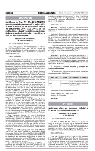 La resolución modifica dos resoluciones ministeriales previas relacionadas con la implementación de la Evaluación Censal de Estudiantes de 2016 en Perú. Se cambian las fechas de la evaluación para el segundo grado de educación secundaria del 16-18 de noviembre al 14-16 de noviembre para evitar coincidir con un simulacro escolar nacional. También se cambia la fecha del quinto simulacro escolar nacional del 15 de noviembre al 22 de noviembre.