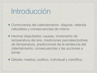 Este documento discute aspectos controversiales del debate sobre el cambio climático global, incluyendo datos y cálculos cuestionables utilizados en reconstrucciones de temperatura de los últimos 1000 años. Señala que los gráficos emblemáticos utilizados por el IPCC y Al Gore se basan en datos de Mann que no son públicos y que han sido criticados por varios estudios académicos. También plantea dudas sobre la calidad de los datos de temperatura actuales y las capacidades de los modelos climáticos.