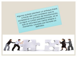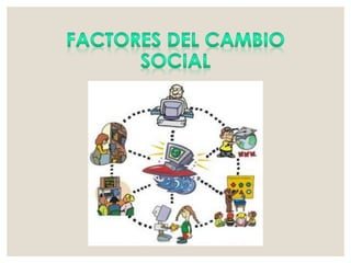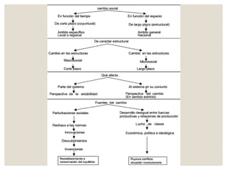 Este documento presenta un resumen de las principales teorías del cambio social, incluyendo el estructural-funcionalismo, marxismo, y teorías de Dahrendorf. También describe factores que contribuyen al cambio social como perturbaciones, innovaciones, y lucha de clases. Finalmente, distingue entre cambios a corto y largo plazo, y explica orientaciones al cambio como la reforma y la revolución.