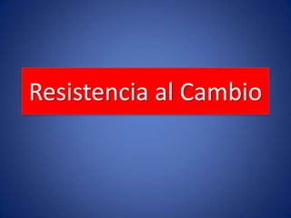 El documento habla sobre la resistencia al cambio a nivel individual y organizacional. A nivel individual, las personas se resisten al cambio debido a hábitos, necesidad de seguridad, preocupaciones económicas y miedo a lo desconocido. A nivel organizacional, las estructuras, enfoques limitados y normas de grupo generan inercia al cambio. Para superar la resistencia se recomienda educar y comunicar ando las razones del cambio y participar a los miembros en la decisión.