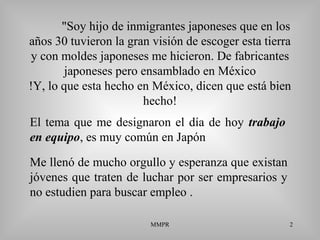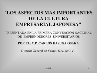 Este documento presenta los aspectos más importantes de la cultura empresarial japonesa según Carlos Kasuga Osaka, director general de Yakult, S.A. de C.V. Describe cuatro diferencias clave entre Japón y México: la actitud ante la vida, la educación, la actitud hacia la naturaleza y la religión. También explica conceptos como el "bien ser", "bien hacer", "bien estar" y "bien tener", y cómo los empresarios japoneses invierten y reinvierten para hacer crecer sus empresas a largo plazo