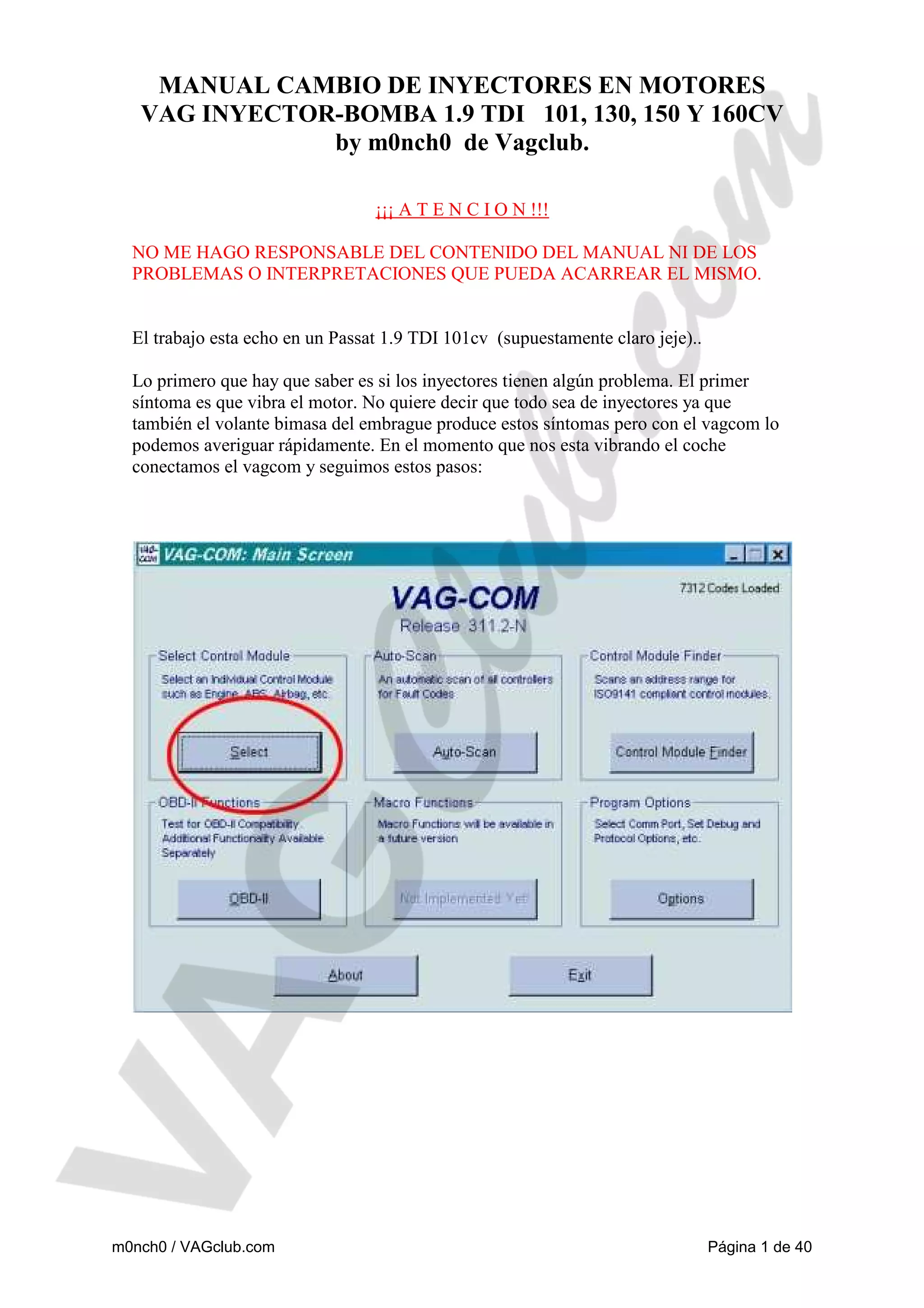 Este documento proporciona instrucciones detalladas para cambiar los inyectores en motores VAG 1.9 TDI de 101, 130, 150 y 160 CV. Explica cómo identificar inyectores defectuosos usando un escáner VAGCOM, lista las herramientas necesarias, y describe el proceso paso a paso para desmontar e instalar nuevos inyectores, incluyendo cómo asegurar las distancias correctas y apretar los tornillos a los pares especificados.