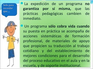 El documento aborda la implementación y efectividad de programas educativos, destacando que la simple expedición de un programa no garantiza cambios inmediatos en las prácticas pedagógicas. Se analizan las características y propósitos de los programas de educación preescolar de 2004 y 2011, enfatizando la necesidad de apoyo profesional y condiciones adecuadas para su desarrollo. Además, se presentan componentes y estándares nuevos que orientan la evaluación y planificación docente en este contexto educativo.
